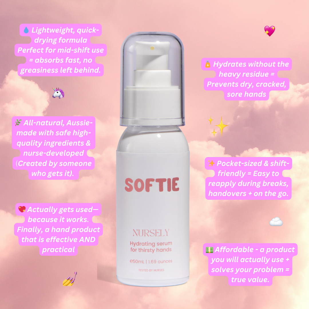 Find quick FAQ's below.Softie is a serum which absorbs fast, hydrates deeper, and never leaves you greasy — perfect for reapplying mid-shift without slowing down. (Who has time to stand still and wait for 15+ minutes without touching anything whilst their thick traditional hand cream soaks in)